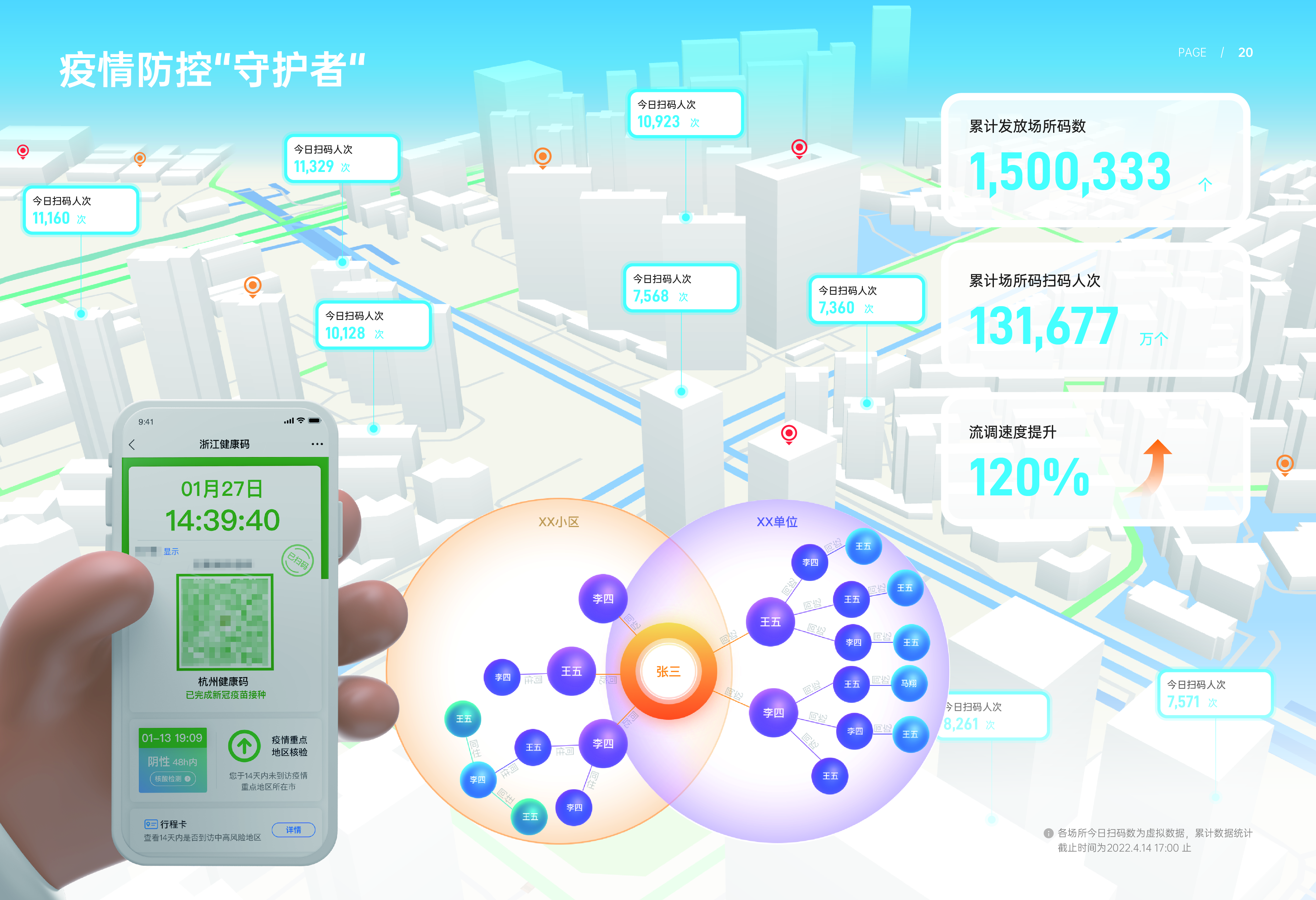 近期,浙江省防控工作新闻发布会上表明,从3月3日开始,浙江爆发了新冠肺炎疫情防控常态化以来波及范围最广、形势最为复杂的一轮疫情,经过各地各部门和全社会共同努力,浙江疫情形势总体平稳,未造成广泛社区传播和外溢。据统计,浙江省本轮总计252起疫情中,222起在1天内实现社会面清零,90%以上的疫情在3天内实现社会面清零。疫情防控阻击战阶段胜利,离不开一线防疫人员坚守行动,同时也离不开大数据科技工具的强力支撑。在全面坚持“外防输入、内防反弹”总策略和“动态清零”总方针指导下,杭州城市大脑技术与服务有限公司(数字杭州)承建开发的“杭州场所码与疫情溯源流调系统”,一直跟随着抗疫一线业务需求迭代升级,从3000QPS的健康码链路性能保障,到25000QPS的市民健康码亮码健康度提升;从杭州场所码绿码通行,到场所码“四码一屏”支持查看48小时核酸采样;从群众主动扫码,到面向“一老一小”的反向帮扫;从单一静态信息展示,到多渠道应用同屏动态呈现;从承载千万级并发量,到智能算法模型支撑城市活力指数精细化计算……数字杭州团队始终以打造“杭州特色”硬核应用为使命,深度参与梳理防疫一线队伍的智能化治理需求,充分发挥建设杭州市级一体化平台的实战经验,为杭州场所码与流调排查系统注入核心战斗力。