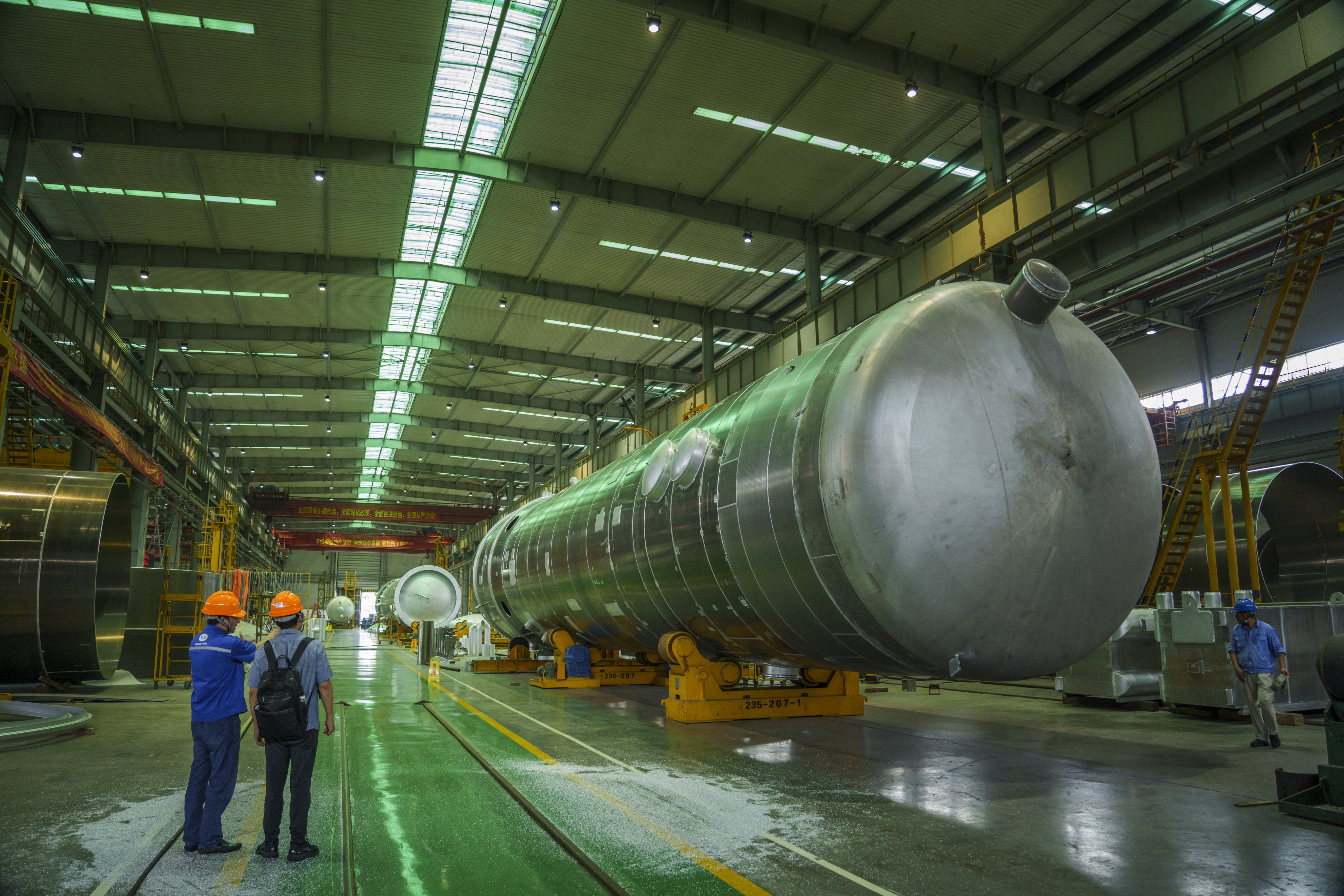 在空分厂房内,记者见到了正在制造之中的宝丰项目塔器产品。与其他整体塔器的制造方式不同,直径近6米的大型塔器被分段施工,犹如“切香肠”式分成多段,便于通过公路长途运输到项目现场,再拼装成整体塔器。这也对制造、运输、安装等各环节提出了更高要求。